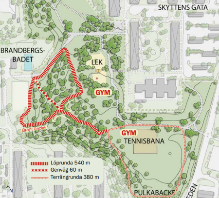 • Hela rundan startar och slutar nära tennisbanan och är 540 meter. En del är brant – perfekt för benträning i backe eller backintervaller.